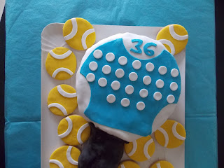 Buenas tardes. Otra de vez de nuevo. Este fin de semana he tenido que entregar otra tarta. Era para un cumpleaños muy, muy , muy especial. Era para un hombre que le encanta todo tipo de deportes, así que me decanté por confeccionar una pala de pádel. Cuando la tenía terminada se me ocurrió realizar unas galletas imitando las pelotas de la pala de pádel. A él le encantó, ya que no se lo esperaba. La tarta todo el que la ha probado le ha encantado, y no porque la haya echo yo, pero estaba muy buena!!!
